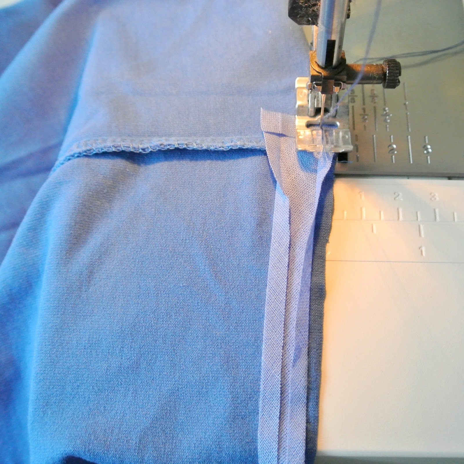 Klap het biaisband helemaal om naar de buitenkant van het vestje. Naai het vast met een stiksel vlak langs de rand. Werk het beginnetje van het biaisband netjes weg.